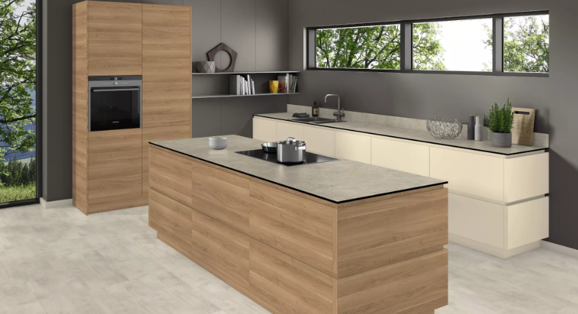 Декор Керамика Тессина имеет однородный и сдержанный рисунок, который может использоваться для создания ровного контраста с очень выразительными древесными репродукциями. В светлом оттенке крем присутствуют вкрапления холодного серого и белого цветов, поэтому он хорошо подходит для создания комбинаций с однотонными декорами из этой цветовой гаммы. Комбинации с древесными репродукциями песочного оттенка смотрятся также очень гармонично. Структура ST87 Минерал керамика подчёркивает текстуру керамических материалов с помощью своего матово-глянцевого эффекта и слегка шероховатой поверхности. Тонкая столешница, изготовленная из компакт-плиты, толщиной всего 12 мм (модель 90/1,0), по продольной кромке которой сверху и снизу срезается фаска. Внутренний слой черного, белого или светло-серого цвета идеально сочетается с декорами.